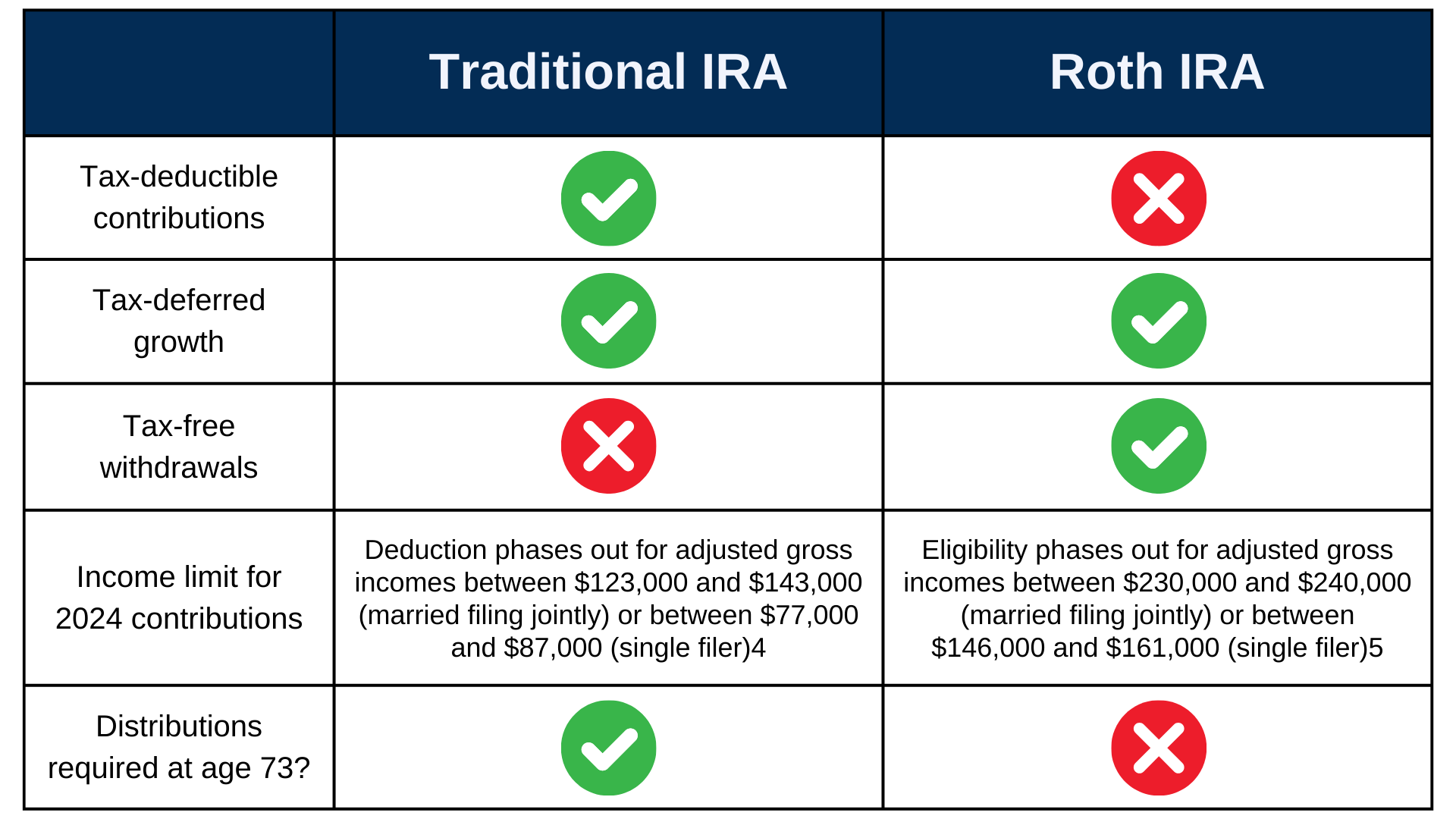 Like a traditional IRA, contributions to a Roth IRA are limited based on income. For 2024, contributions to a Roth IRA are phased out between $230,000 and $240,000 for married couples filing jointly and between $146,000 and $161,000 for single filers.4